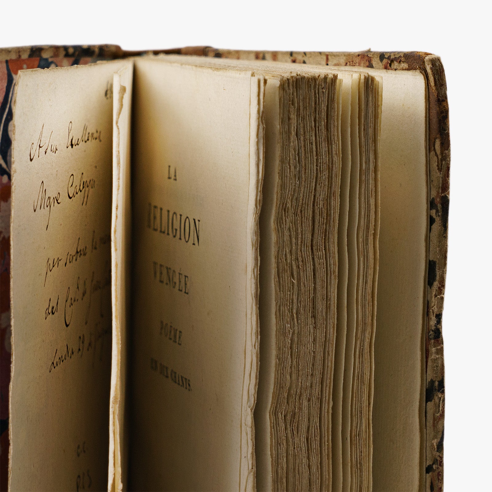 BERNIS (François-Joachim de Pierre de) [1715–1794].— LA // RELIGION // VENGÉE // POËME // EN DIX CHANTS. // À PARME // DANS LE PALAIS ROYAL // MDCCXCV.— In-8.º., [xxviii], 248 p. E. editorial em papel marmorizado, com lombada e cantos em pele.