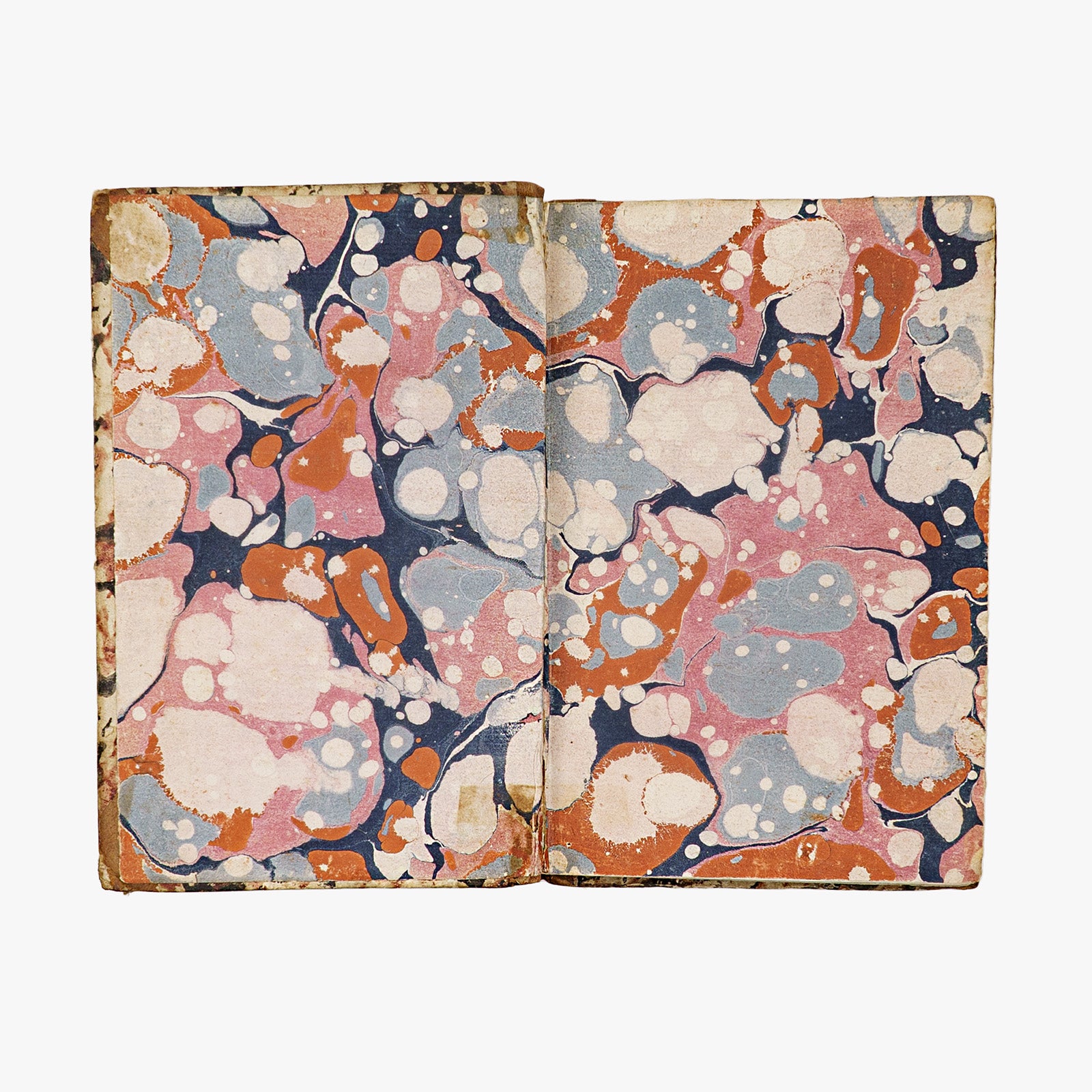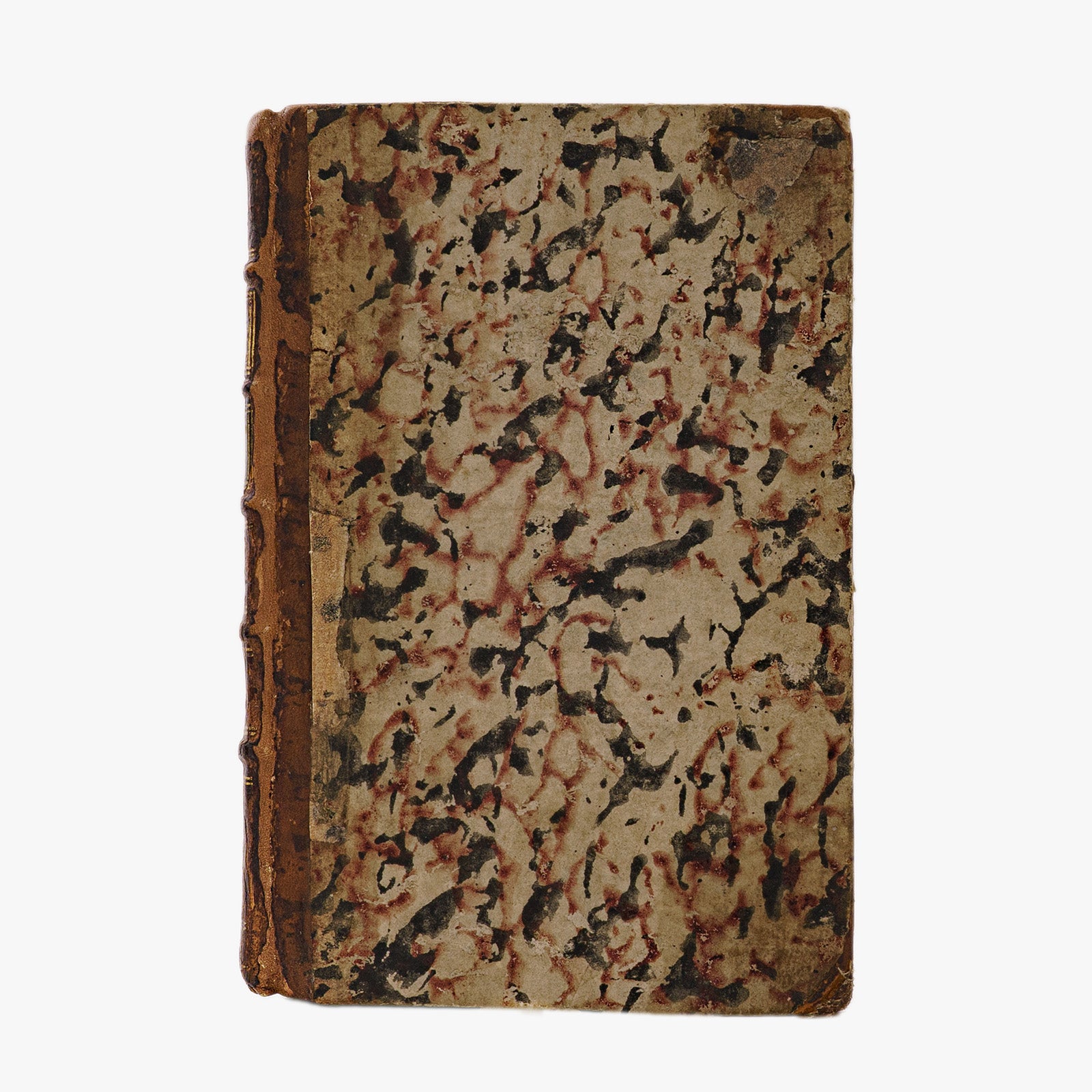 O exemplar encontra-se em bom estado de conservação, notável considerando sua idade e raridade. A lombada e os cantos apresentam desgaste leve, com pequenas perdas superficiais no couro. O papel marmoreado conserva cores vivas e uniformes, com alguns pontos de desgaste, sobretudo nas extremidades. O miolo está íntegro, com cortes limpos, papel firme e bem preservado, mantendo impressão homogênea e legível. Há apenas discretos pontos de oxidação e escurecimento marginal leve, típicos da época. As costuras permanecem firmes, e a encadernação mantém estrutura sólida, preservando integralmente o caráter original da edição. 1.ª edição, 1795.