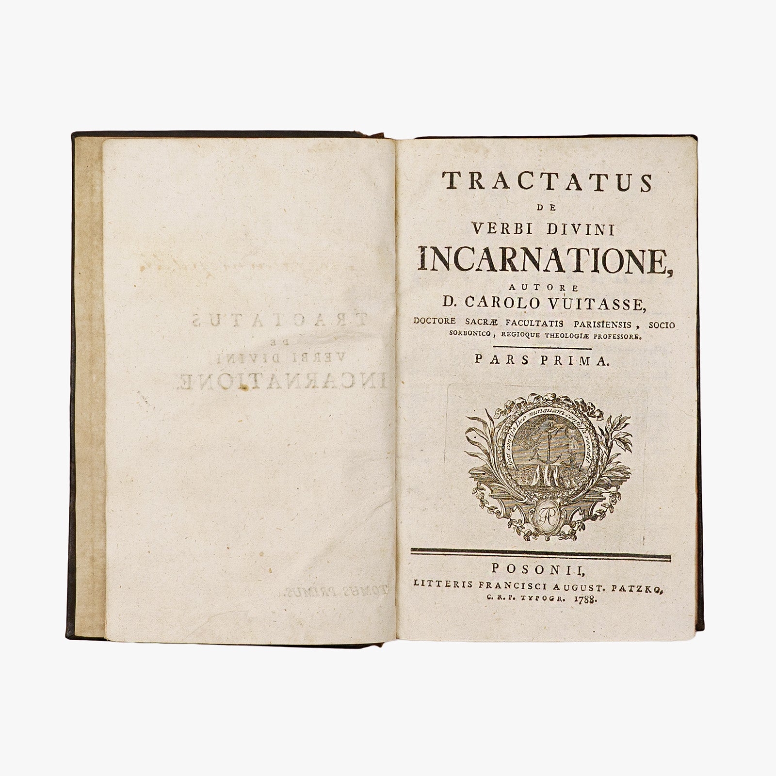 VUITASSE (Carolo) [1661–1731]TRACTATUS // DE // VERBI DIVINI // INCARNATIONE, // AUTORE // D. CAROLO VUITASSE, // DOCTORE SACRÆ FACULTATIS PARISIENSIS, SOCIO // SORBONICO, REGIQUE THEOLOGIÆ PROFESSORE. // [———] // PARS PRIMA. // PARS SECUNDA. // [emblema calcográfico em medalhão oval: âncora ereta cravada sobre rochedo, com mar ao fundo; listel periférico com a legenda “Spes confisa Deo nunquam confusa recedit”; composição ladeada por folhagens e volutas, rematada em cartela inferior com monograma entrelaçado “AP”] // [———] // POSONII, // LITTERIS FRANCISCI AUGUST. PATZKO, // C. R. P. TYPOGR. 1788.— In-12.º., 2 v. (Vol I: 485, [3] p.; Vol II: 632, [4] p.). E. coeva em couro.