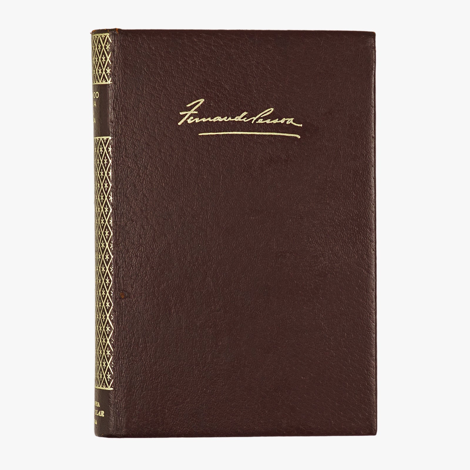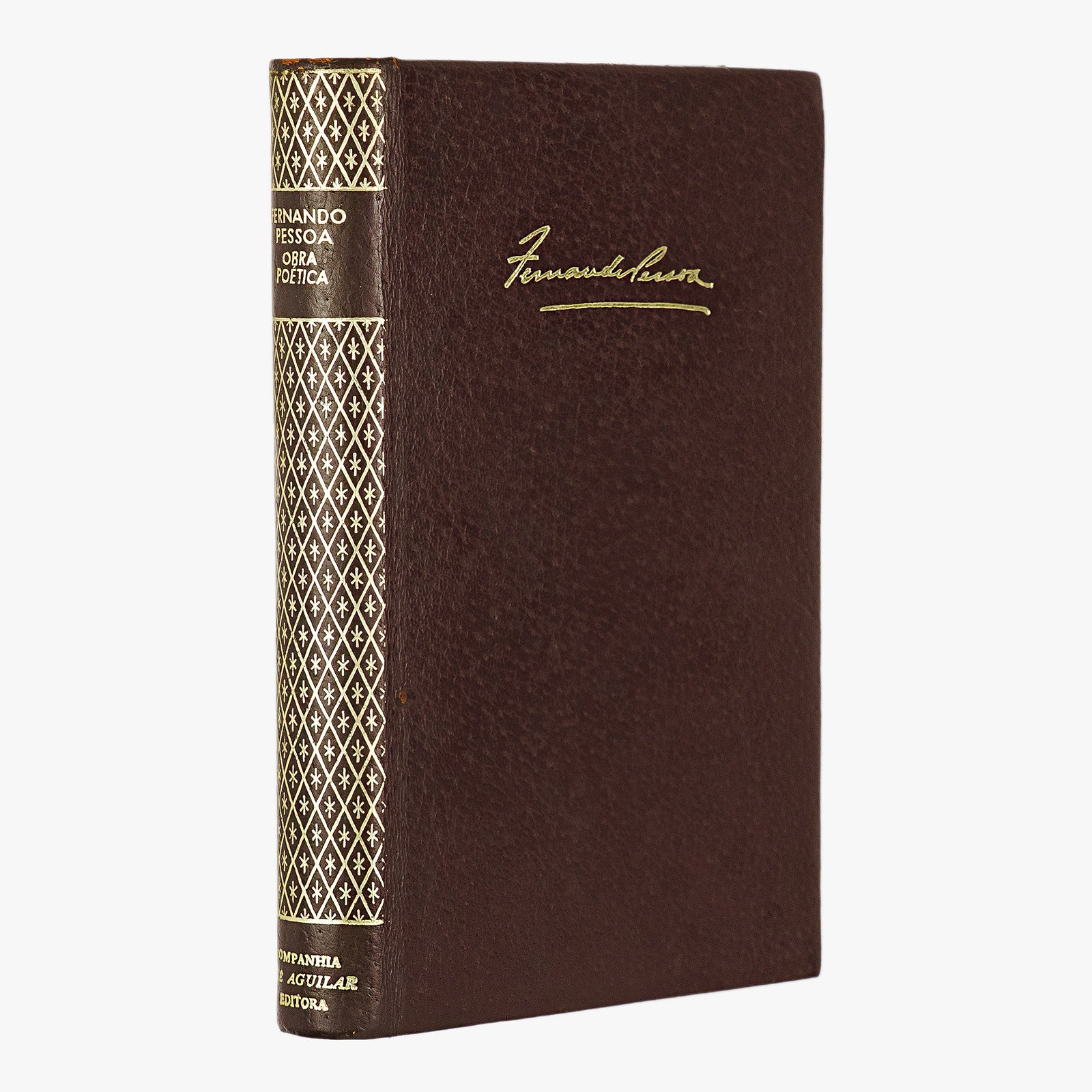 PESSOA, (Fernando António Nogueira) [1888–1935].— BIBLIOTECA // LUSO-BRASILEIRA // Série Portuguêsa // FERNANDO PESSOA // OBRA POÉTICA // em um volume // INTRODUÇÃO GERAL // A POESIA DE FERNANDO PESSOA // MENSAGEM // O MARINHEIRO // FP, UM ENCONTRO DE POESIA. CRONOLOGIA // POESIA DE FERNANDO PESSOA // MENSAGEM. // À MEMÓRIA DO PRESIDENTE-REI SIDÓNIO PAIS. // QUINTO IMPÉRIO. CANCIONEIRO. // FICCÕES DO INTERLÚDIO // POEMAS COMPLETOS DE ALBERTO CAEIRO // ODES DE RICARDO REIS. POESIAS DE ÁLVARO DE CAMPOS. // PARA ALÉM DOUTRO OCEANO DE COELHO PACHECO. // POEMAS DRAMÁTICOS // NA FLORESTA DO ALHEAMENTO. // O MARINHEIRO. PRIMEIRO FAUSTO. // POESIAS COLIGIDAS // INÉDITAS 1919–1935. // POEMAS INGLÊSES. FRANCESES. // POEMAS TRADUZIDOS PARA O PORTUGUÊS. // QUADRAS AO GÔSTO POPULAR // 325 QUADRAS. // POEMAS PARA LILI. POEMA PIAL. // APÊNDICE // NOTAS E VARIANTES. BIBLIOGRAFIA. // [marca editorial da coleção Biblioteca Luso-Brasileira em tinta preta: escudo com iniciais “BLB” e livro aberto, coroado por ramo de louros] // [——] // RIO DE JANEIRO, GB, COMPANHIA JOSÉ AGUILAR EDITÔRA, 1972 // [desenho do autor em preto e branco por Almada Negreiros] // FERNANDO PESSOA, DESENHO DE ALMADA NEGREIROS // [assinatura fac-símile do autor em tinta preta] // FERNANDO // PESSOA // OBRA // POÉTICA // Organização, Introdução e Notas, de // MARIA ALIETE GALHOZ // [marca tipográfica da Companhia José Aguilar Editôra em vermelho, com escudo e legenda “COMPANHIA JOSÉ AGUILAR EDITÔRA”] // [——] // RIO DE JANEIRO, GB, COMPANHIA JOSÉ AGUILAR EDITÔRA, 1972.— In-12.º., 786, [2] p. E. editorial em couro.