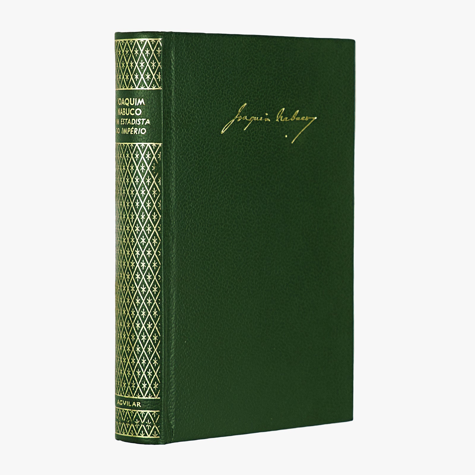Encadernação editorial plena em couro verde, com douração preservada na ornamentação e descrições na lombada e em fac-símile da assinatura de Nabuco na capa. Guardas íntegras e preservadas, estampadas com o monograma da coleção (BBL). Corte superior com tingimento em avermelhado, preservado. Miolo íntegro, limpo e firme, sem manchas de acidez relevantes. Algumas primeiras e últimas folhas levemente amareladas, com alguns pontos de oxidação, sem comprometimento de textos ou ilustrações. 4.ª edição, 1975.