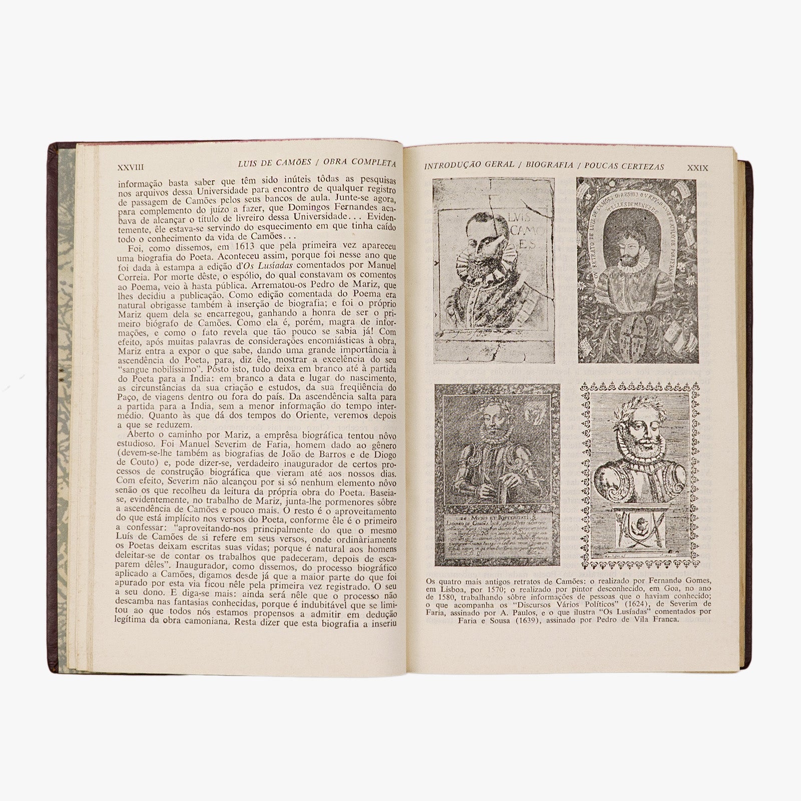 CAMÕES (Luís Vaz de) [c.1524-1580].— LUÍS // DE CAMÕES // OBRA // COMPLETA // Organização, introdução, comentários // e anotações do // PROF. ANTÔNIO SALGADO JÚNIOR // [Marca editorial da Editora José Aguilar, com emblema vermelho em forma de escuto com livro aberto e as letas "J" e "A" entrelaçadas, encimadas por coroa de louros, símbolo de erudição e triunfo intelectual] // —— // RIO DE JANEIRO, GB, COMPANHIA AGUILAR EDITÔRA, 1963.— In-12.º., CIX, [2], 1.029, [2] p. E. editorial em couro.