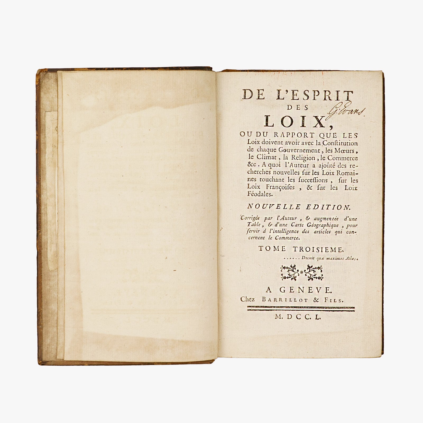 MONTESQUIEU (Charles-Louis de Secondat, baron de La Brède et de Montesquieu) [1689–1755].–– De L'ESPRIT // DES // LOIX, // OU DU RAPPORT QUE LES // Loix doivent avoir avec la Constitution // de chaque Gouvernement, les Mœurs, le Climat, la Religion, le Commerce, &C. // A quoi l’Auteur a ajoûté des recherches // nouvelles sur les Loix Romaines touchant // les successions, sur les Loix Françoises, // & sur les Loix Féodales. // NOUVELLE EDITION. // Corrigée par l’Auteur, et augmentée d’une Table // des Matieres, et d’une Carte Geographique, // pour servir à l'intelligence des articles qui con- // cernent le Commerce. // TOME PREMIER // ......Prolem sine matre creatam. // TOME SECOND // ......Docuit que mâximus Atlas. // TOME TROISIEME // ......Docuit que mâximus Atlas // [Vignette typographique allégorique en gravure, ornement caractéristique de l’atelier Barillot] // A GENEVE, // Chez BARILLOT & FILS. // –––––– // M. DCC. LI.— 3 vol. in-12. Tome I: [4], vii, xxviii, 447 pp. — Tome II: [4], xxiii, 427 pp. — Tome III: [2], xxiv, 510, 98 pp. Complet.