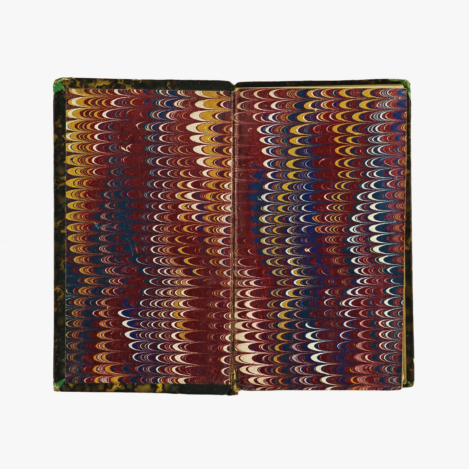 O volume apresenta encadernação em meia-pele preta da época, com lombada em nervuras e título dourado; capas em papel marmorizado em tons de marrom e amarelo; guardas marmorizadas multicoloridas e cortes dourados em todas as faces — acabamento de luxo.